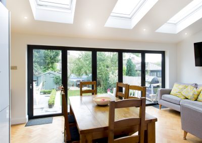 Claire and Jerome loved their house but wished for a large kitchen dinner/lounge so all the family could be in one room without feeling on top of one another. The builders created this longed for space by extending to the rear of the house, removing the main wall at the back of their home. The builders made the whole area light and airy by installing large bi-folding doors opening up on to a raised patio and incorporated a vaulted ceiling with large Velux roof windows further adding to the feeling of light and space. The whole area was complemented with the installation of parquet flooring and a high-end modern kitchen. North East Bricklaying Network are still in contact with Claire and Jerome, who assure us they are still very much in love with their new home.